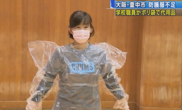 病院の防護服が足りない中、大阪・豊中市の学校職員がポリ袋で防護服の代用品を作っている、というニュースだった。大型のポリ袋を型紙に合わせてつなぎ合わせていく。代用品は1着約2分で作れる簡単なものだが、診察用として十分使えるということだ。