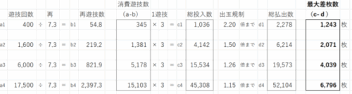 上記の表を見て説明すると、出玉規制では約2時間~2時間半の1600ゲームではせいぜい2000枚程度で1日弱の6000ゲーム約10時間でもせいぜい4000枚程度が規制上の上限出玉(差枚数)である。
