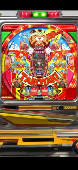 たこやき器をモチーフにしたであろうステージに、串を持って左右に動いてる焼きのおじさんらしき人。丸穴に玉が入ると、なんかなるのかな?と軽く妄想して、両替を済ませて勝負開始。