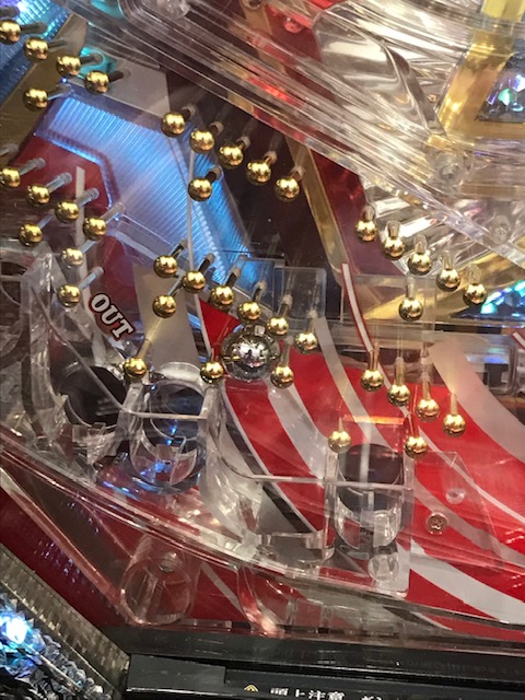 7. 玉がかかってる左釘は勢いを殺して左入賞させる為の釘、右釘は右入賞に繋がるステップ釘。最終的に入賞を左右する命釘とは異なりますね。